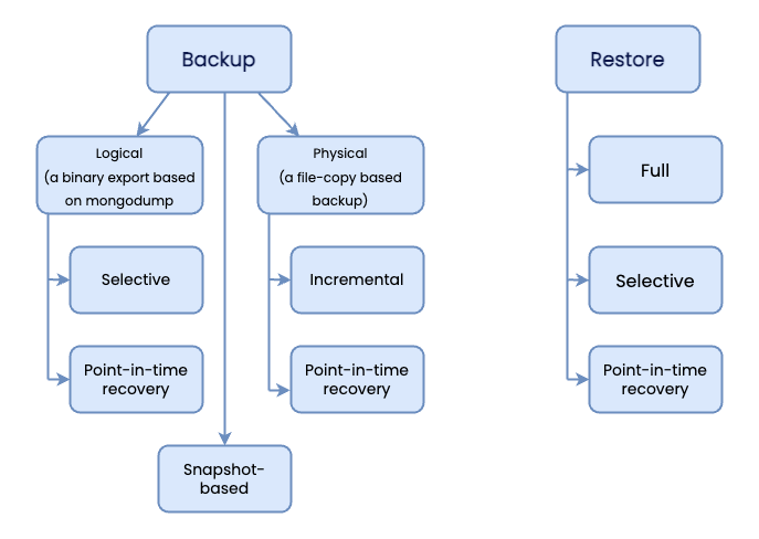 Full restore of a database to a specific point in time with guaranteed data consistency Sharded clusters and non-sharded replica sets Yes Yes* (logical only)